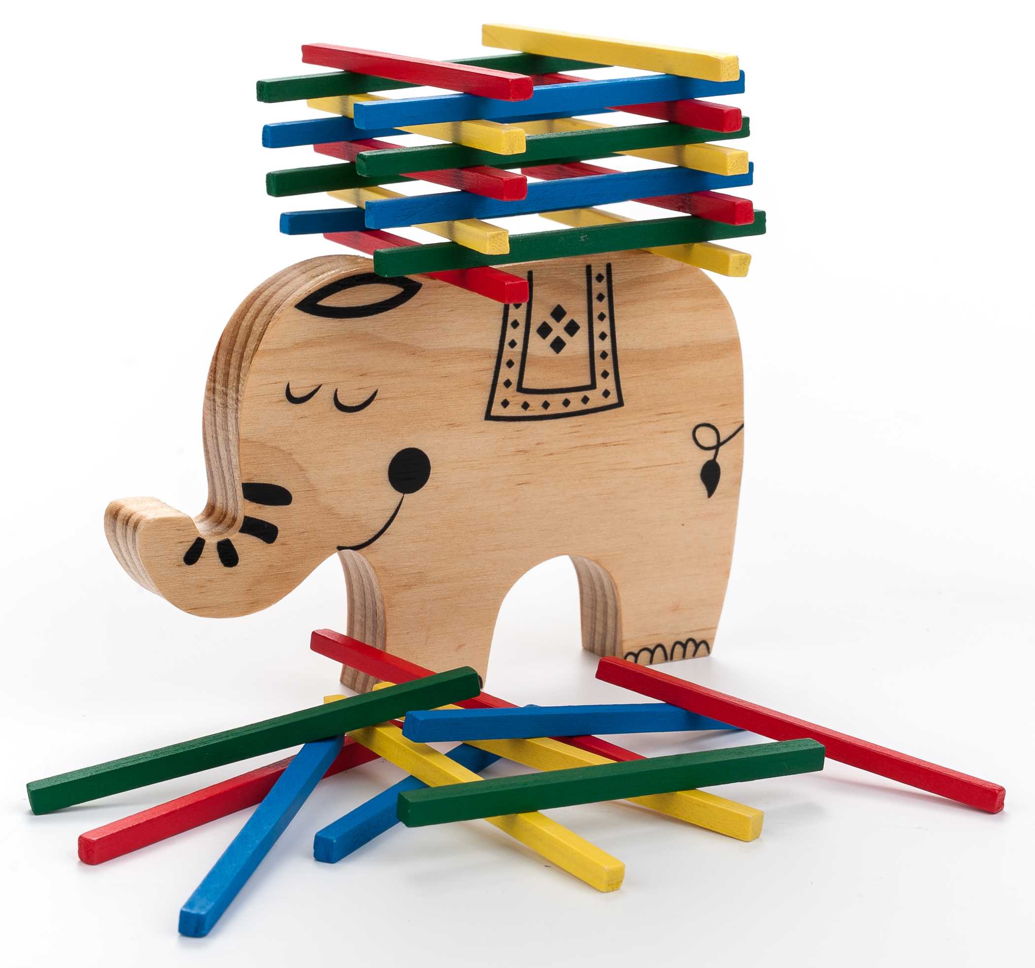 Spelers leggen om de beurt de stokjes op de rug van de olifant, zonder ze eraf te laten vallen ! De winaar is degene die al zijn stokjes op de olifant heeft geplaatst zonder ze om te laten vallen. 1 tot 4 spelers.