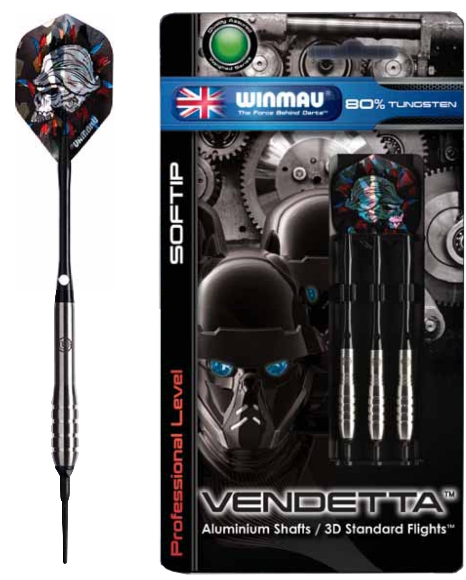 Darts Winmau Vendetta Softtip. Gewicht 18 gram. Nickel Tungsten 80% op blister. Inclusief aluminium shafts en holografische flights. Winmau Vendetta SOFTTIP 2085 18gr.NT 80%